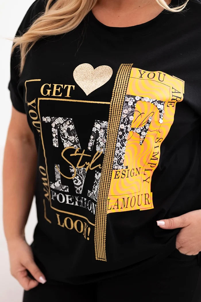 Bavlnená dámska blúzka Plus Size s potlačou a flitrami čierna + oranžová univerzálne