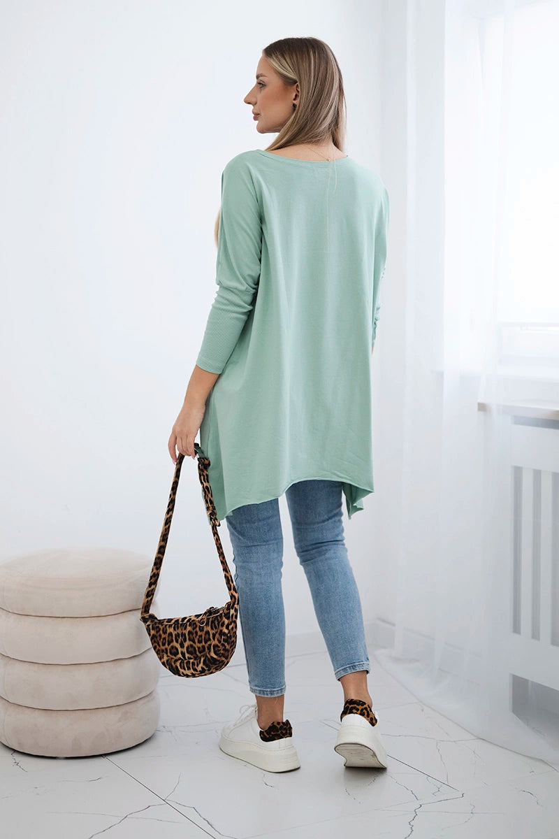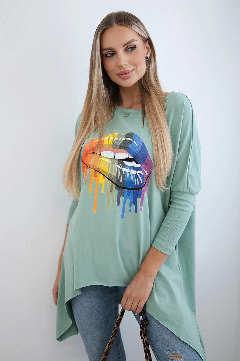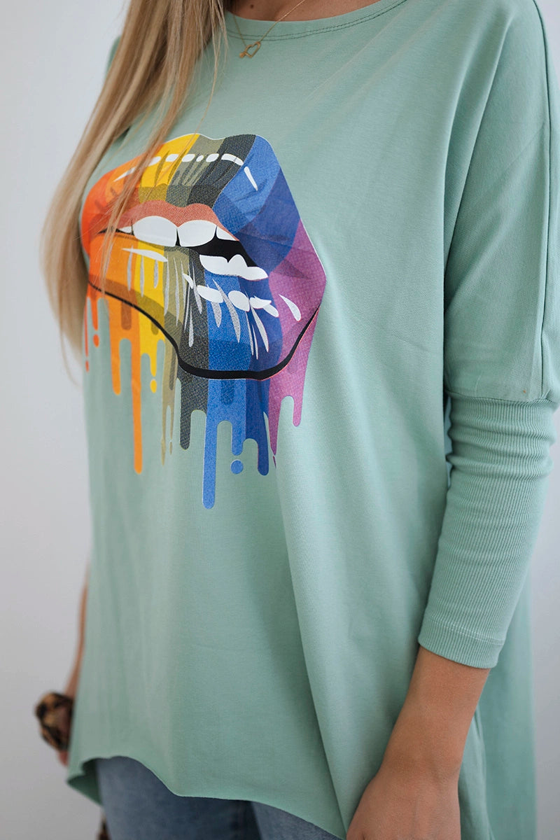Blúzka oversize s potlačou dúhových pier tmavá mäta univerzálne