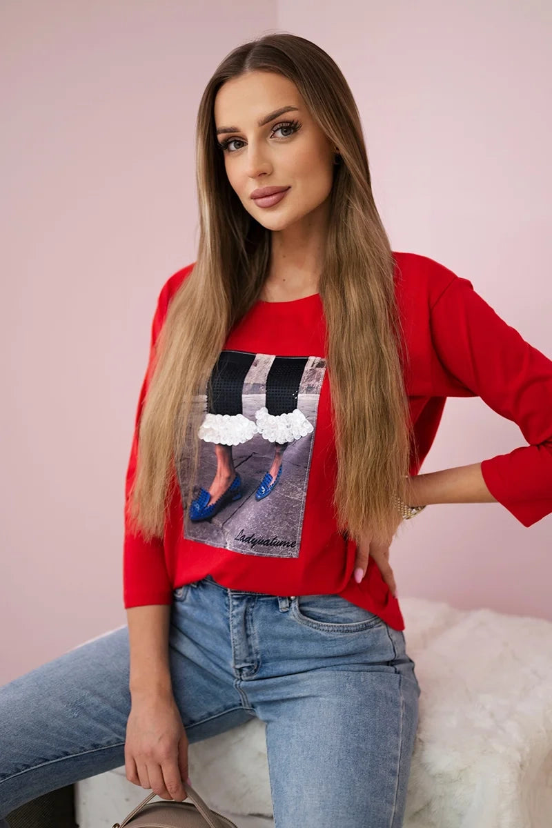 Blúzka s grafikou 3D so zirkónmi červená univerzálne