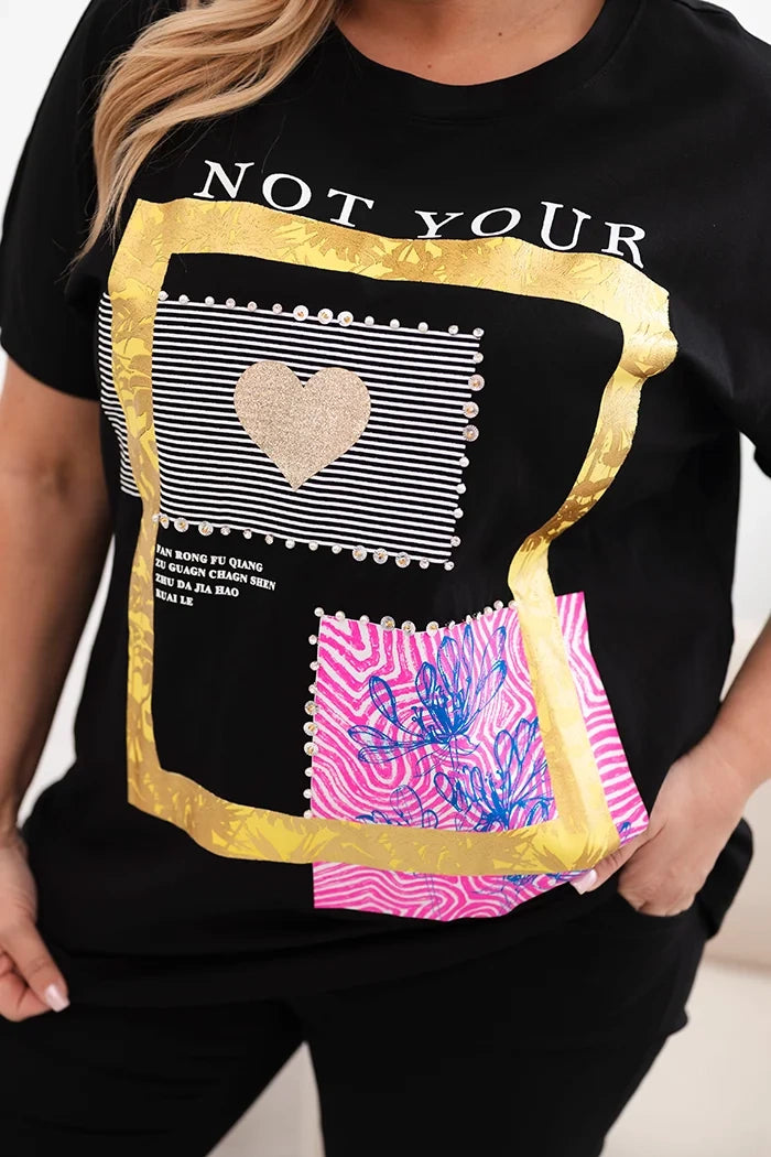 Dámska bavlnená blúzka Plus Size so zlatým nápisom čierna + žltá univerzálne