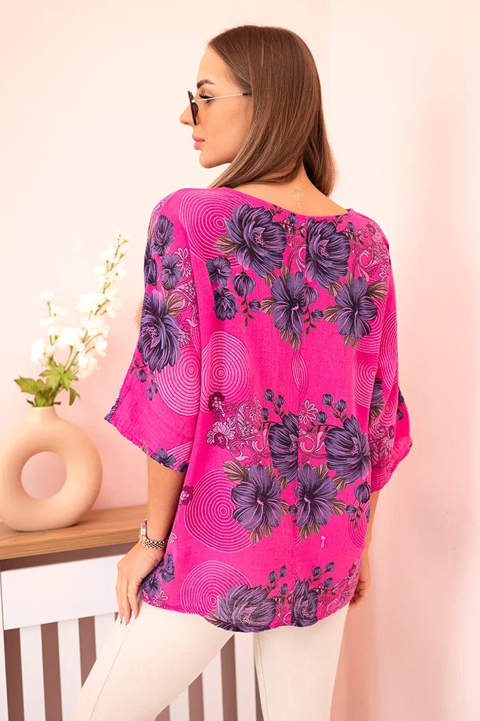 Dámska bavlnená blúzka s krátkym rukávom a kvetinovým vzorom fuchsia univerzálne