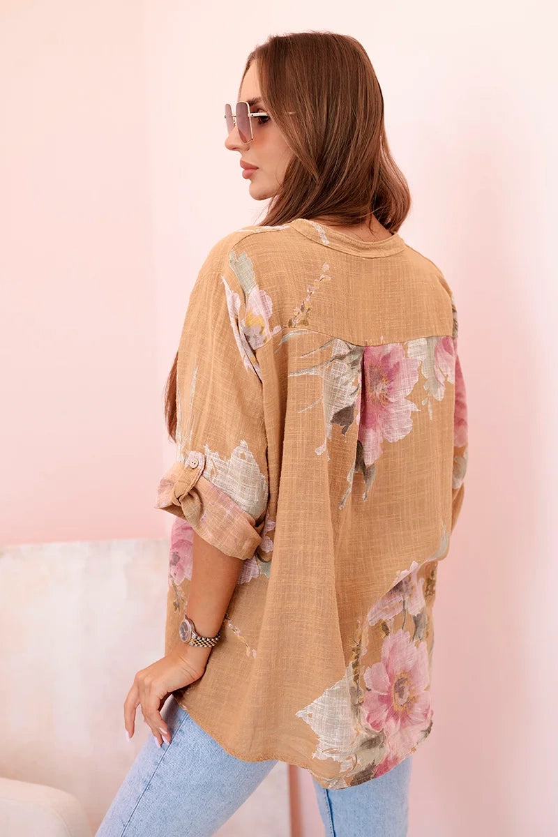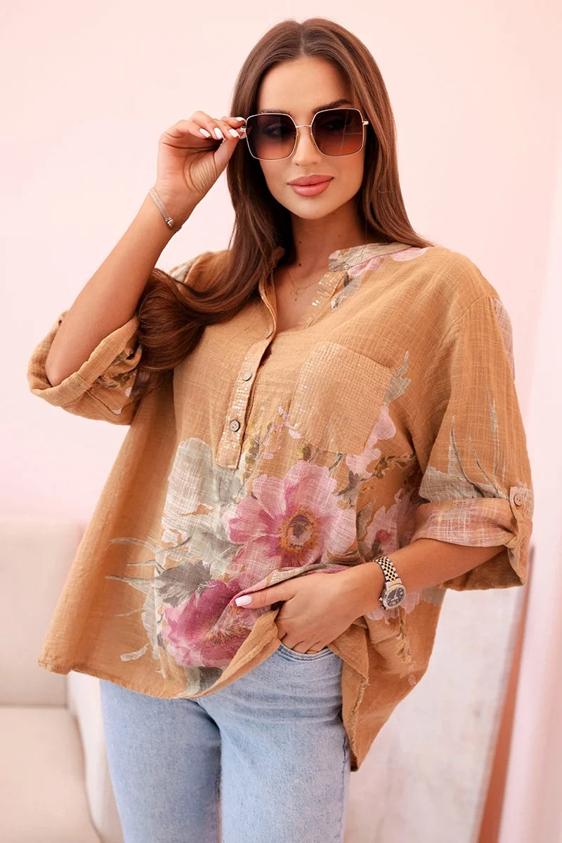 Dámska bavlnená blúzka s kvetinovým vzorom a gombíkmi - camelová univerzálne