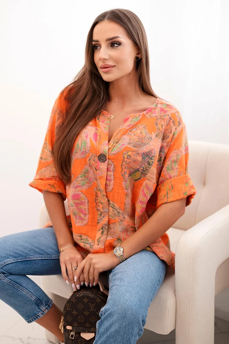 Dámska bavlnená blúzka s motívom motýľov a gombíkmi - oranžová univerzálne
