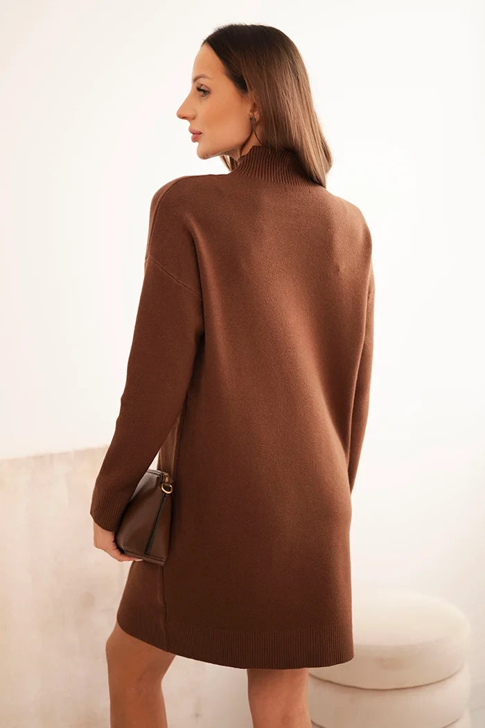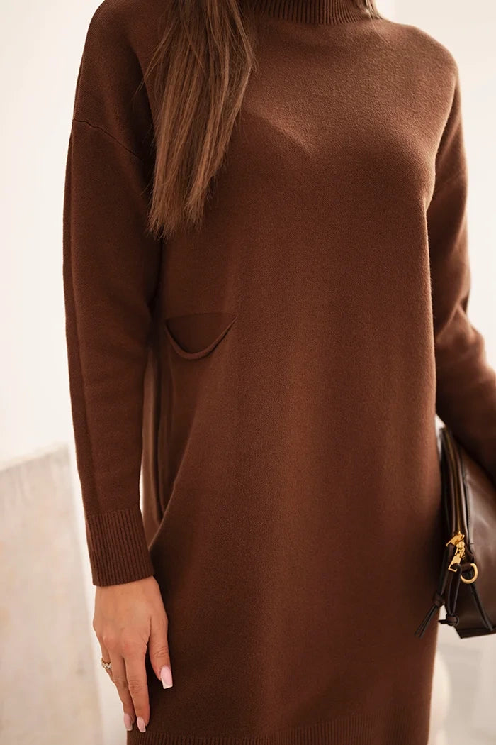 Dámska sveterová šaty s golierom a vreckom hnedá univerzálne