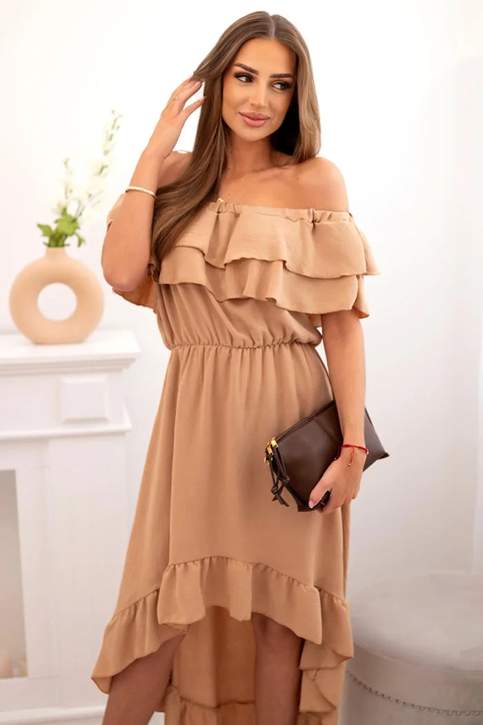 Dámske šaty s odhalenými ramenami a dlhším chrbtom ťava univerzálne