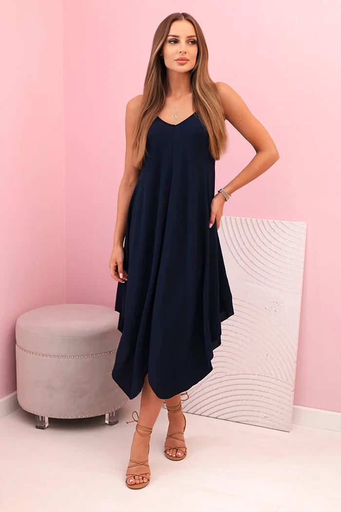 Dámske šaty s ramienkami rozšírenými s asymetrickým lemom námornícka modrá univerzálne