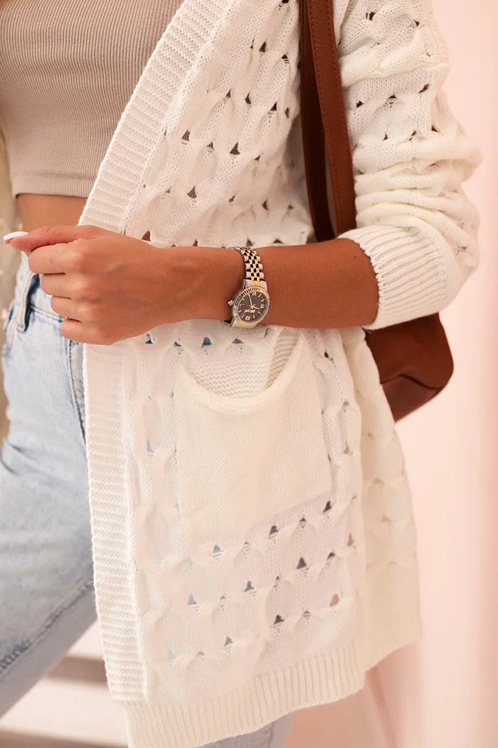 Dámsky azerovaný kardigán s vreckami ecru univerzálne