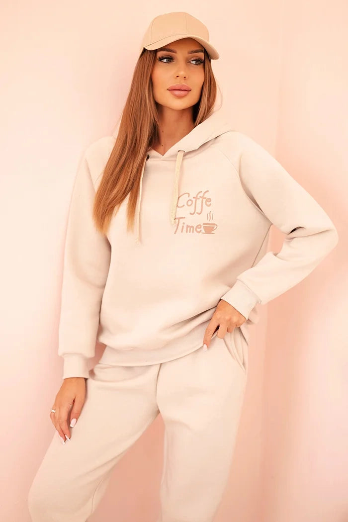 Tento dámský zateplený dres je ideální volbou na chladnější dny. Vyrobený z měkkého, příjemného materiálu, zajišťuje maximální komfort nošení jak doma, tak na procházce nebo při každodenních aktivitách. Mikina s kapucí a potiskem „Coffe Time“ dodává celku uvolněný, pohodový charakter, zatímco kalhoty s elastickým pasem skvěle padnou na postavu.