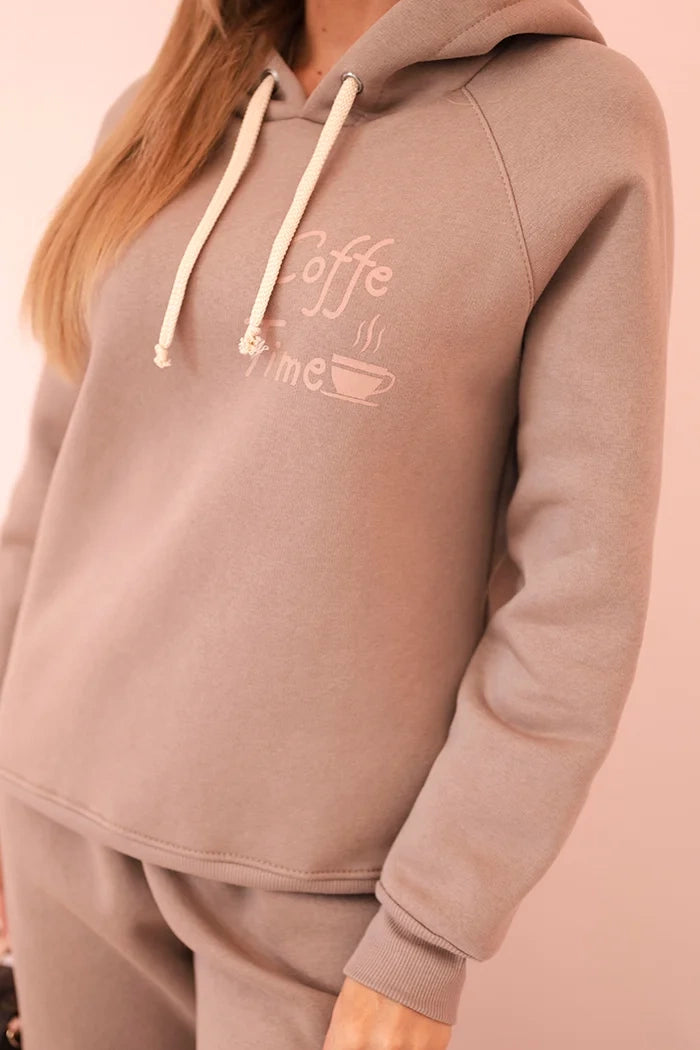 Tento dámský zateplený dres je ideální volbou na chladnější dny. Vyrobený z měkkého, příjemného materiálu, zajišťuje maximální komfort nošení jak doma, tak na procházce nebo při každodenních aktivitách. Mikina s kapucí a potiskem „Coffe Time“ dodává celku uvolněný, pohodový charakter, zatímco kalhoty s elastickým pasem skvěle padnou na postavu.