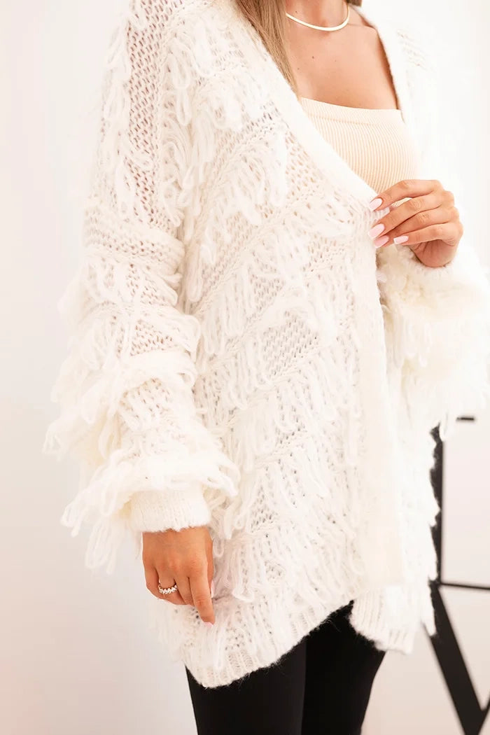 Dámsky kardigán s strapcami a voľným strihom ecru univerzálne