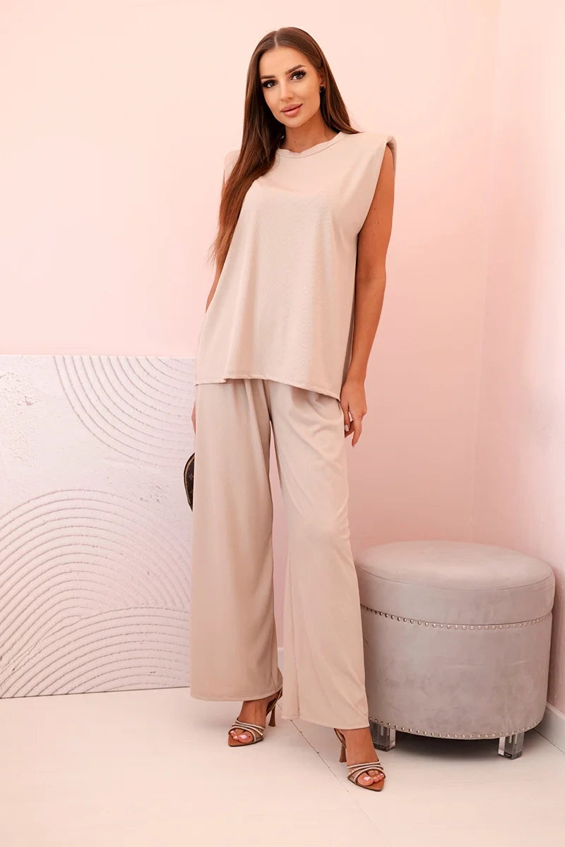 Dámsky komplet z viskózy bez rukávov a s rovnými nohavicami tmavobežový univerzálne