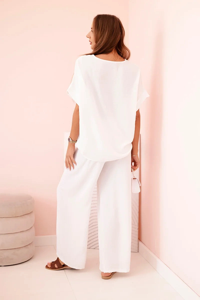 Dámsky komplet z viskózy s ozdobným kvetom a širokými nohavicami - fuksia biela univerzálne