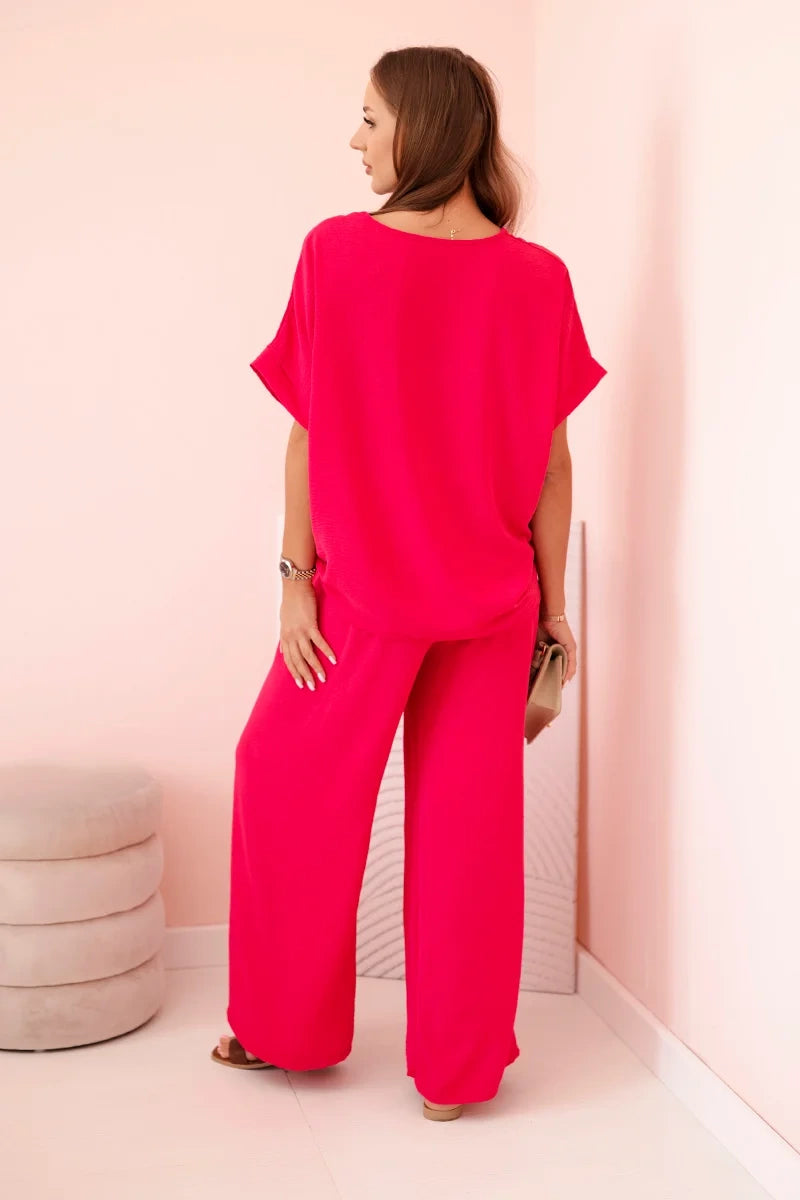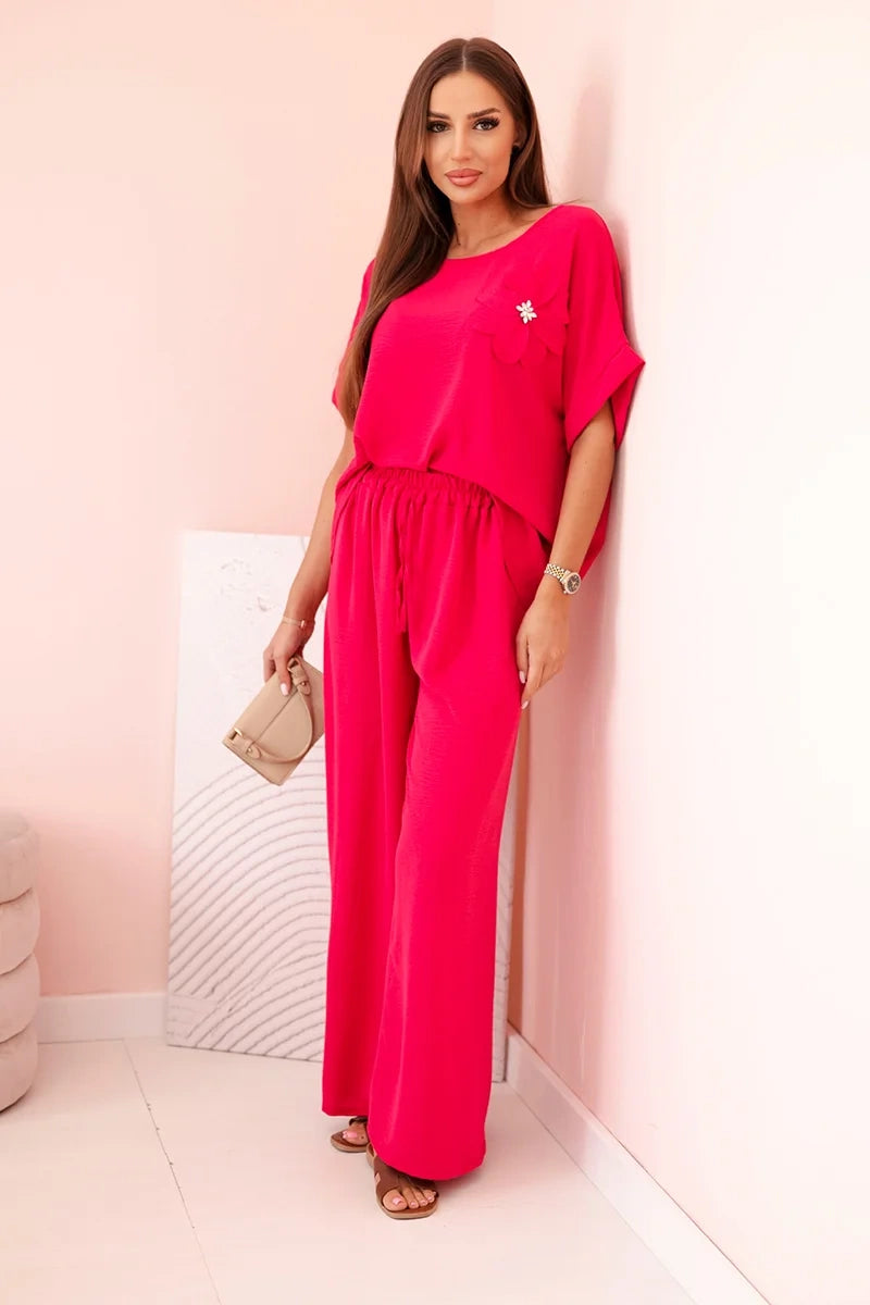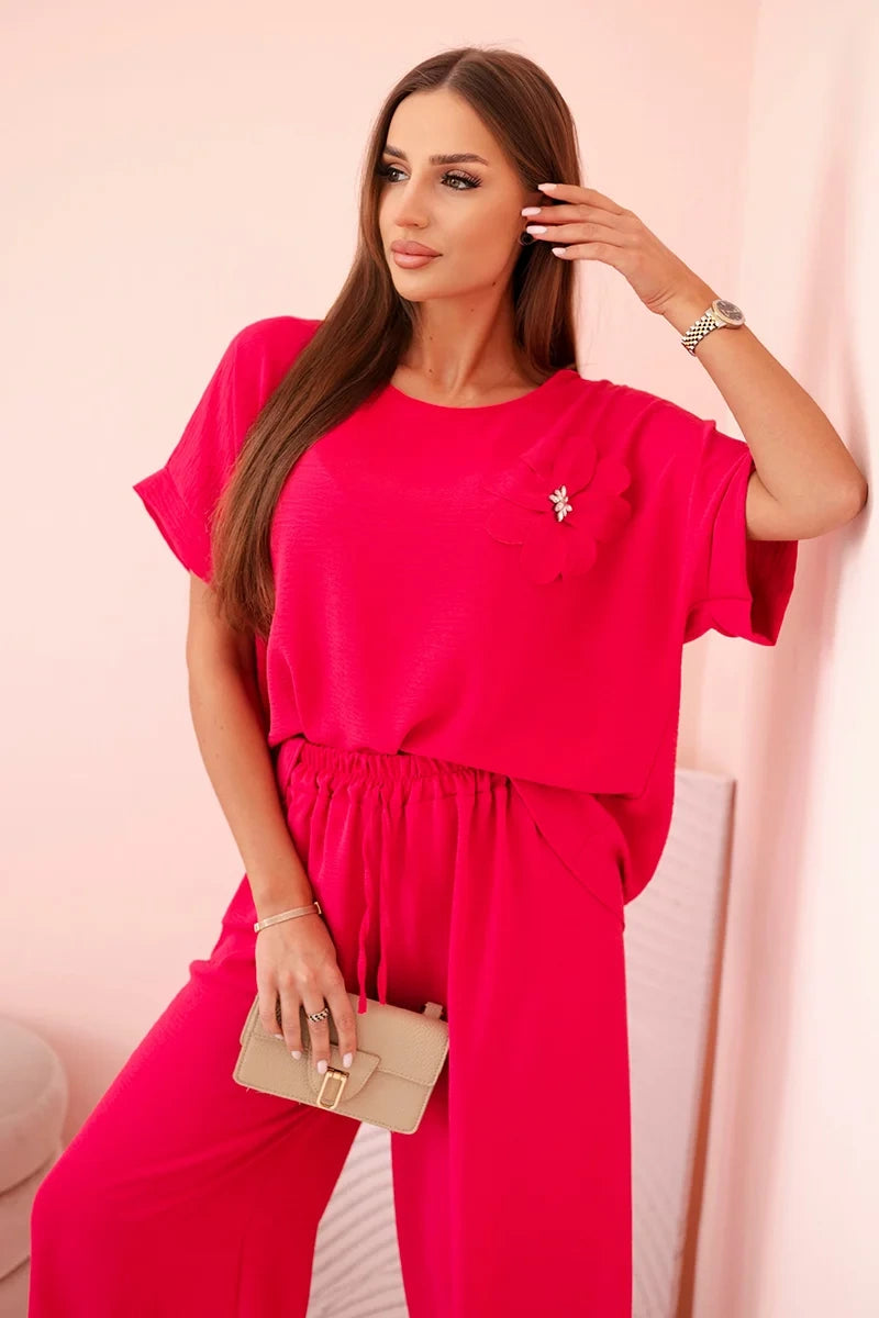 Dámsky komplet z viskózy s ozdobným kvetom a širokými nohavicami - fuksia univerzálne