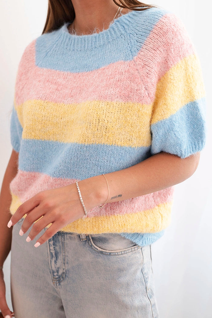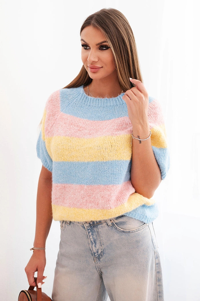 Dámsky pruhovaný sveter s krátkym rukávom z vlny žltý + modrý univerzálne