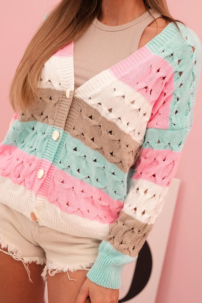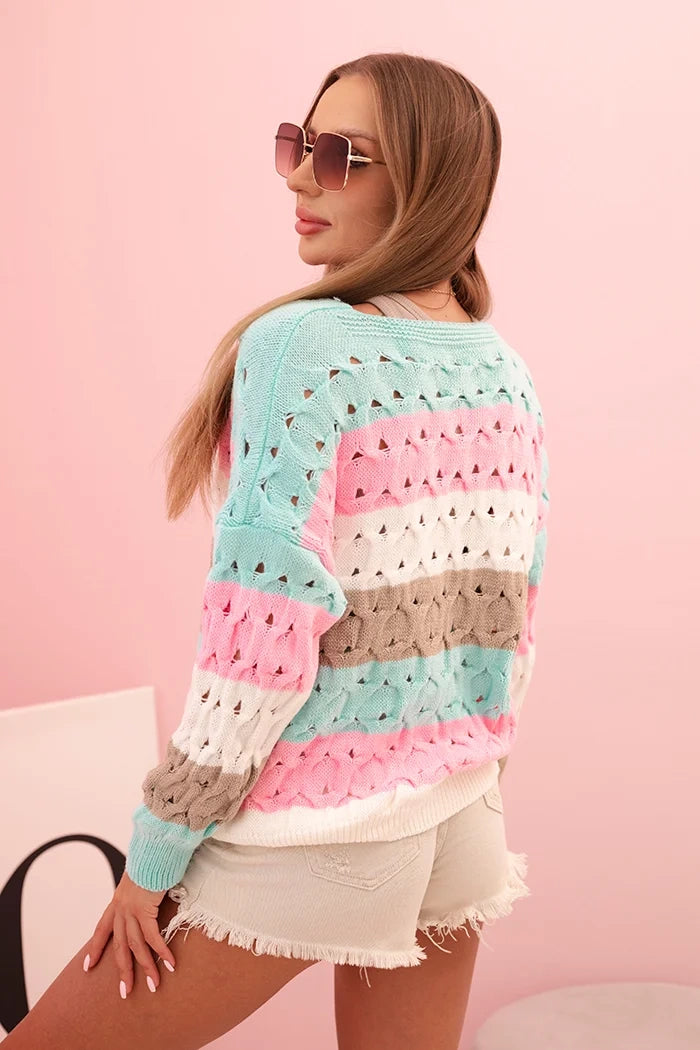 Dámsky pruhovaný sveter s V výstrihom a otvorenými očkami mentolový + fango univerzálne