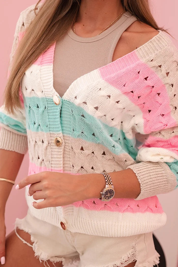 Dámsky pruhovaný sveter s V výstrihom z priehľadného materiálu béžový + mätový univerzálne