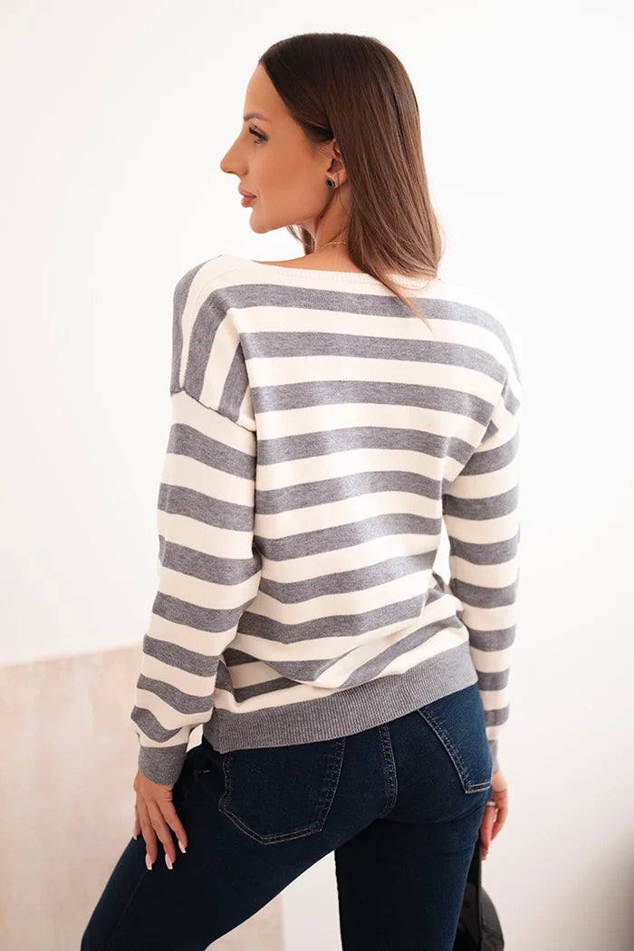 Dámsky pruhovaný sveter s výstrihom do V šedý univerzálne