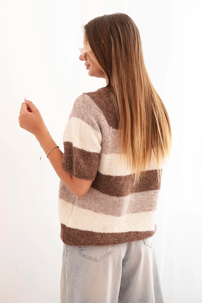 Dámsky sveter s krátkym rukávom prúžkovaný z vlny béžový + hnedý univerzálne