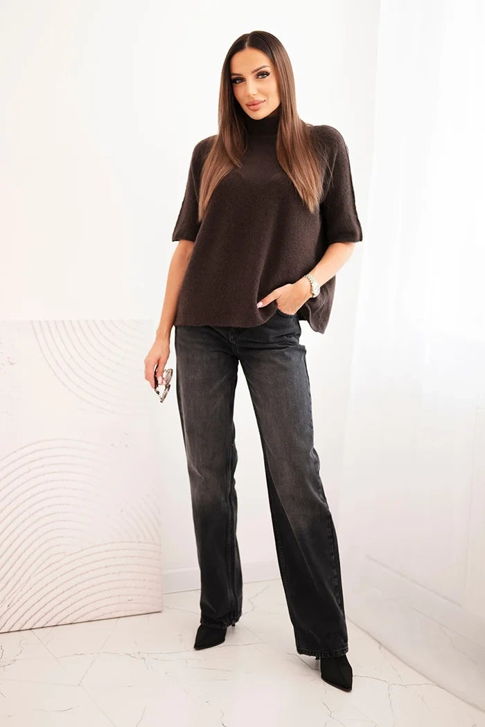 Dámsky sveter s krátkym rukávom vo voľnom strihu hnedý univerzálne