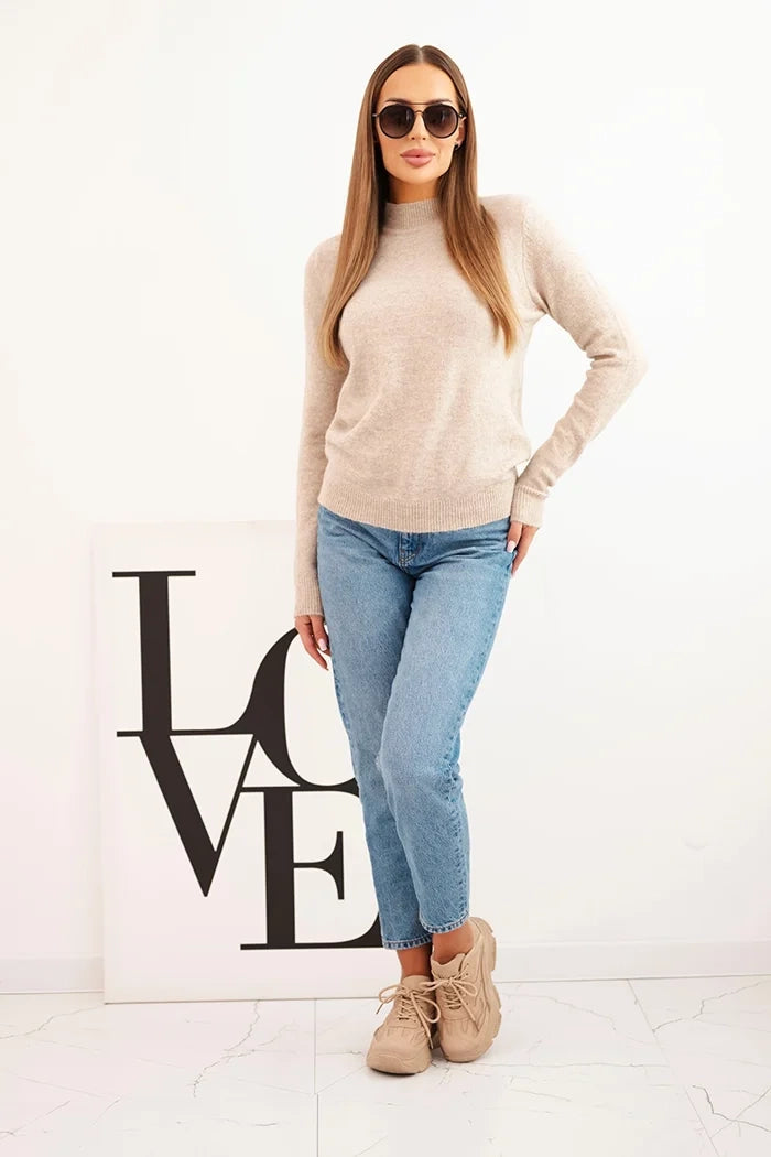 Dámsky sveter s polokruhovým golierom z mäkkej priadze tmavo béžový univerzálne