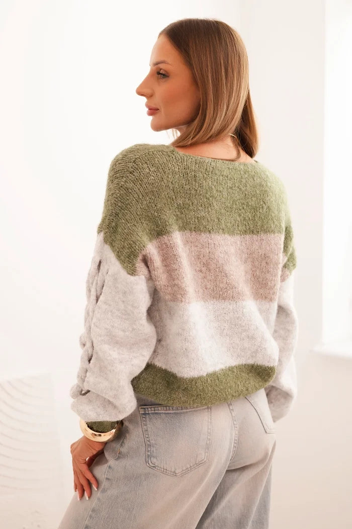 Dámsky sveter s pruhmi a vrkočmi na rukávoch z vlny khaki + šedý univerzálne
