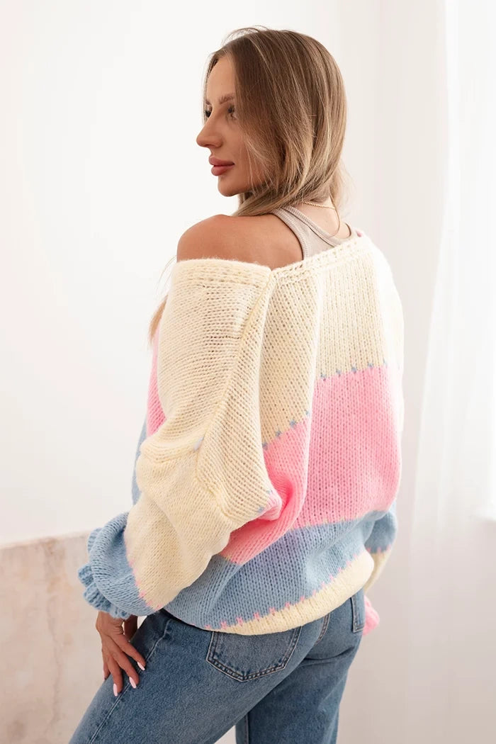 Dámsky sveter s prúžkami a gombíkmi žltý + svetlo ružový univerzálne