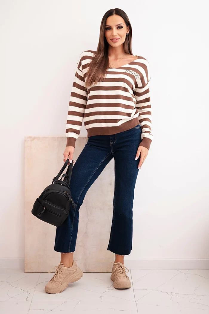 Dámsky sveter s prúžkami a V výstrihom hnedý univerzálne