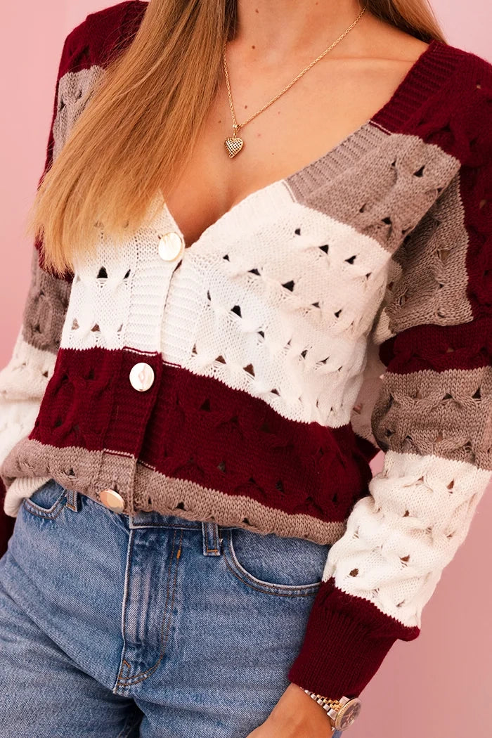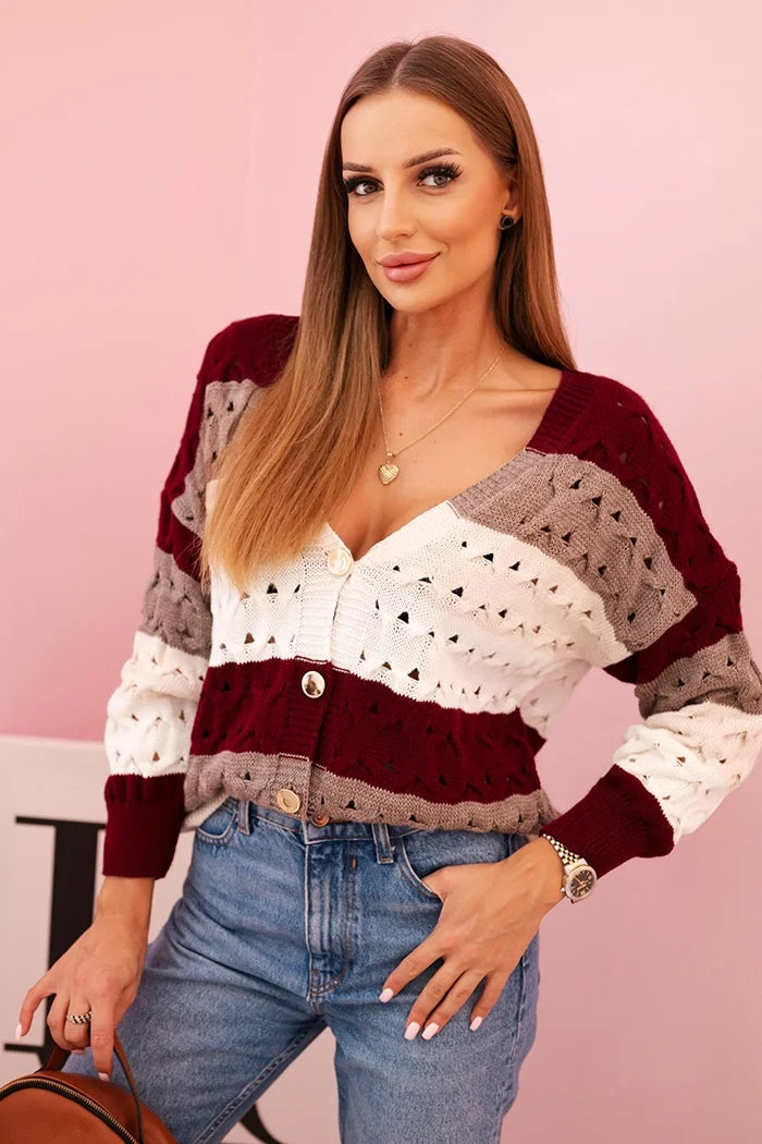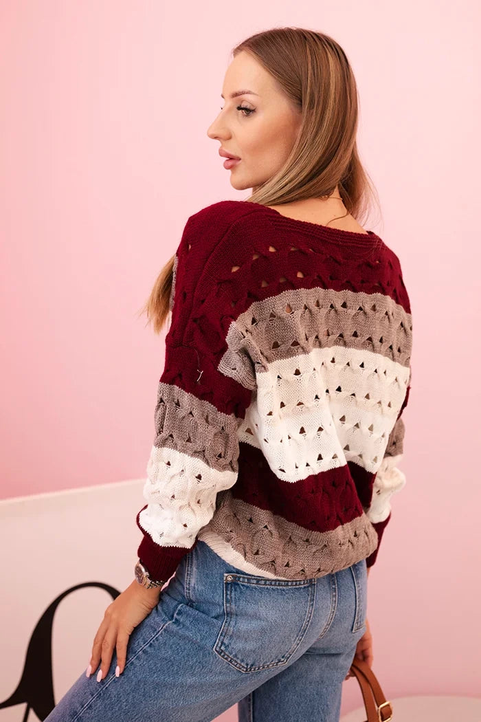 Dámsky sveter s prúžkami a výstrihom do V bordový + svetlo béžový univerzálne