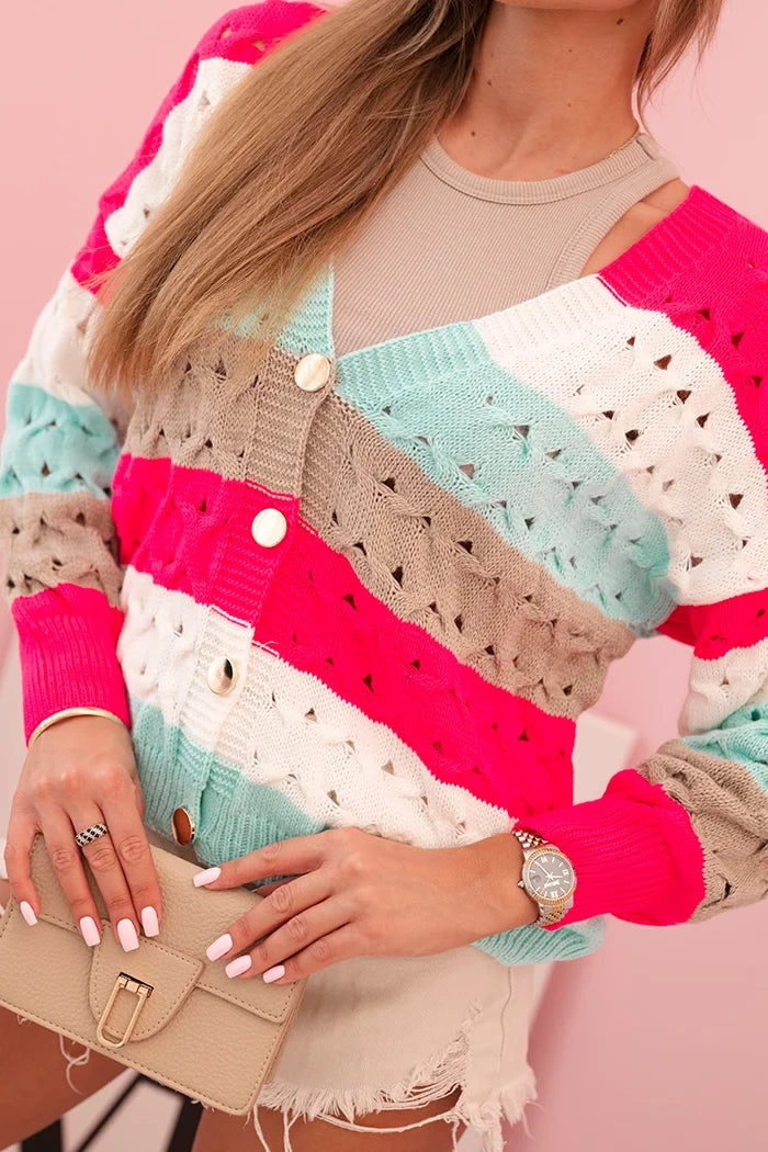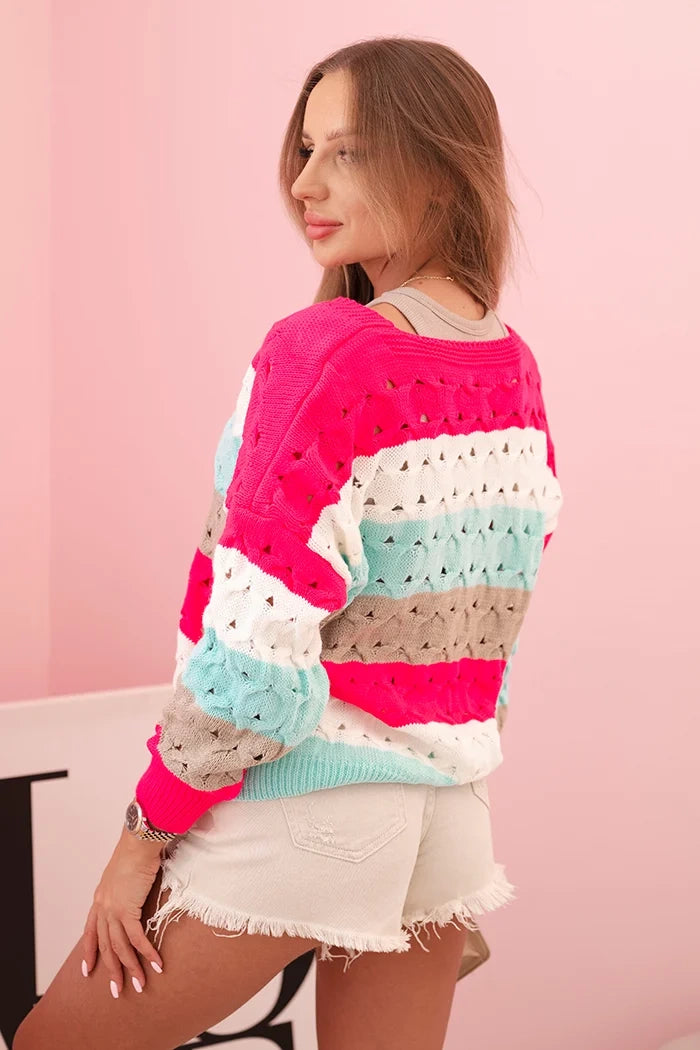 Dámsky sveter s prúžkami a výstrihom do V fuksia + fango univerzálne