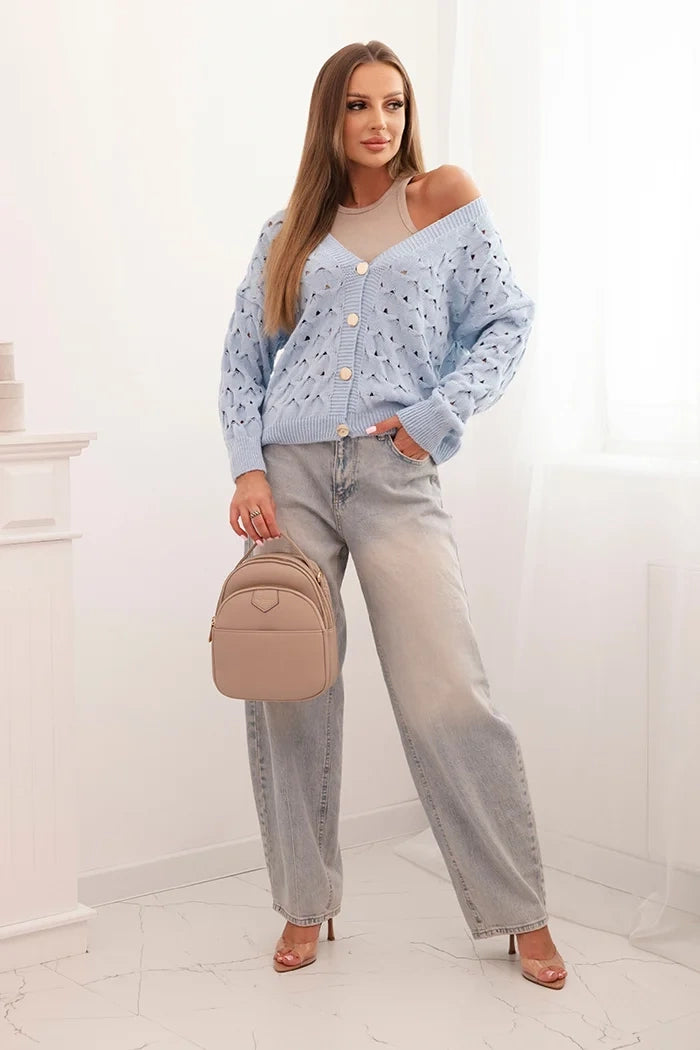 Dámsky sveter s výstrihom do V a zlatými gombíkmi modrý univerzálne