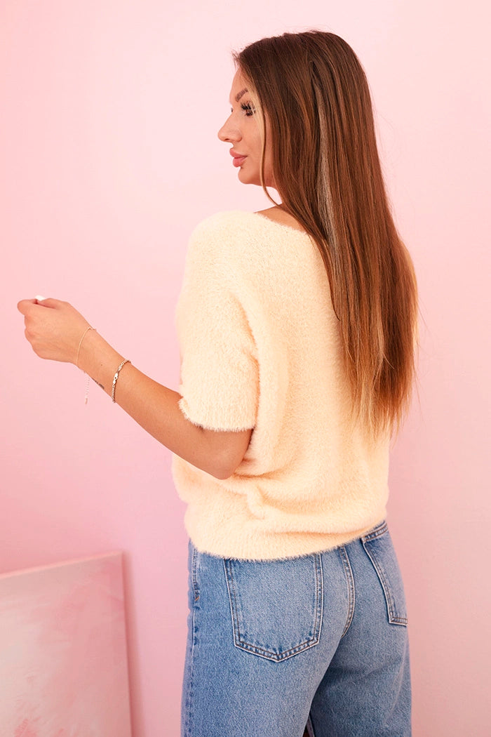 Dámský chlupatý svetr krátký rukáv meruňkový