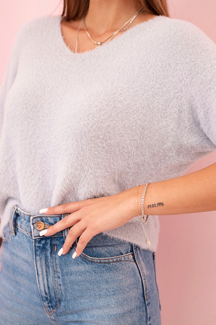 Stylový dámský svetr s příměsí mohairu je skvělým návrhem na chladnější dny. Volný střih s jemným výstřihem do V zajišťuje pohodlí při nošení a svobodu pohybu, zatímco subtilní vzor propletený do pleteniny dodává celku lehkost. Materiál je měkký, příjemný na dotek a dobře udržuje teplo.