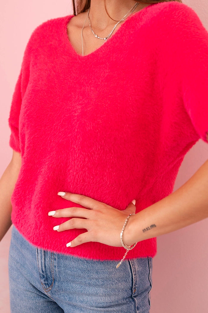 Dámský chlupatý svetr krátký rukáv fuchsiová
