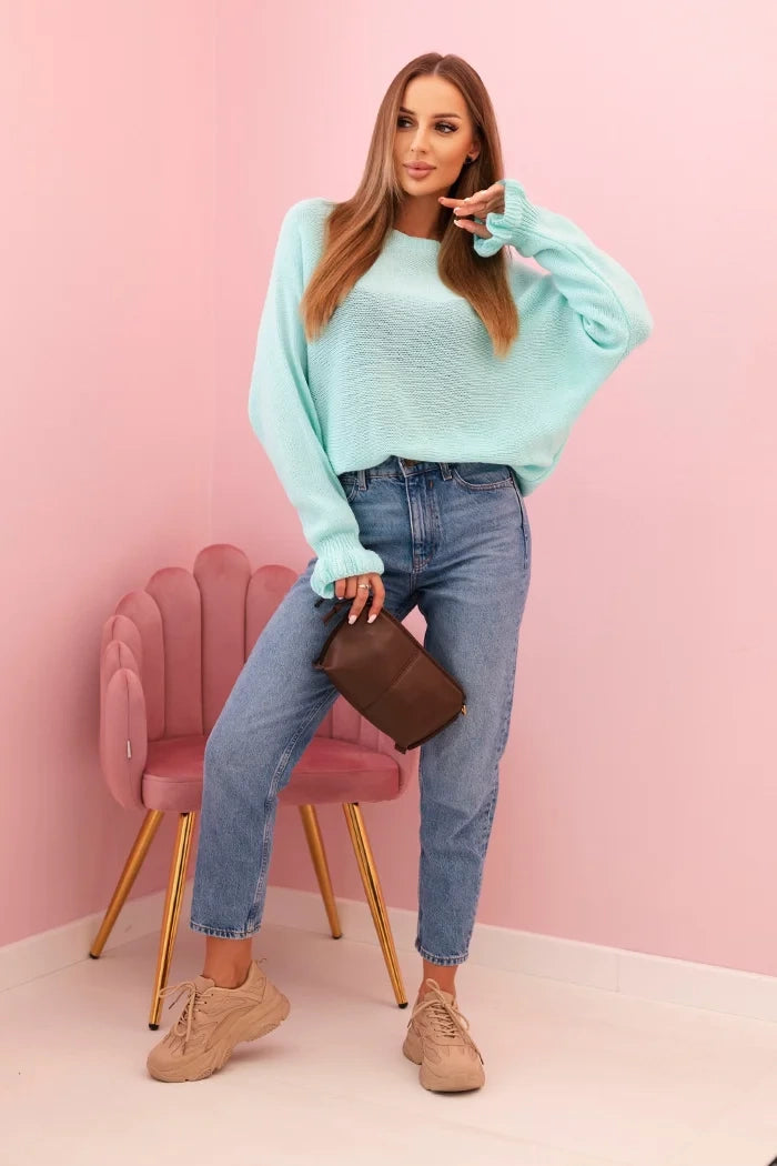 Dámsky sveter z mohéru s nariasenými rukávmi a výstrihom na chrbte mentolový univerzálne