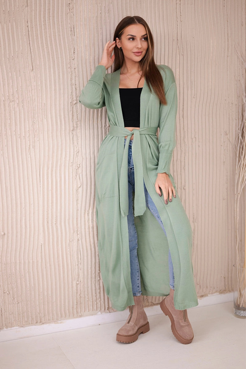 Dlhý kardigánový sveter so zaväzovaním v páse tmavá mäta univerzálne