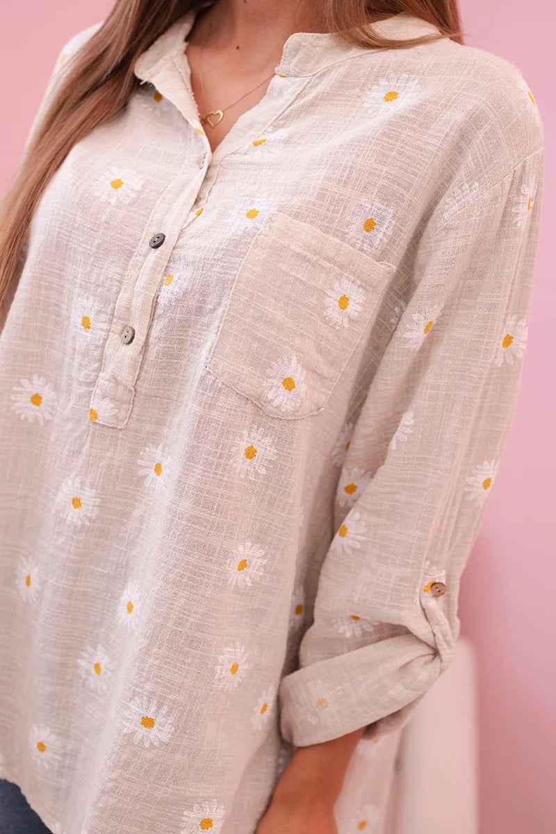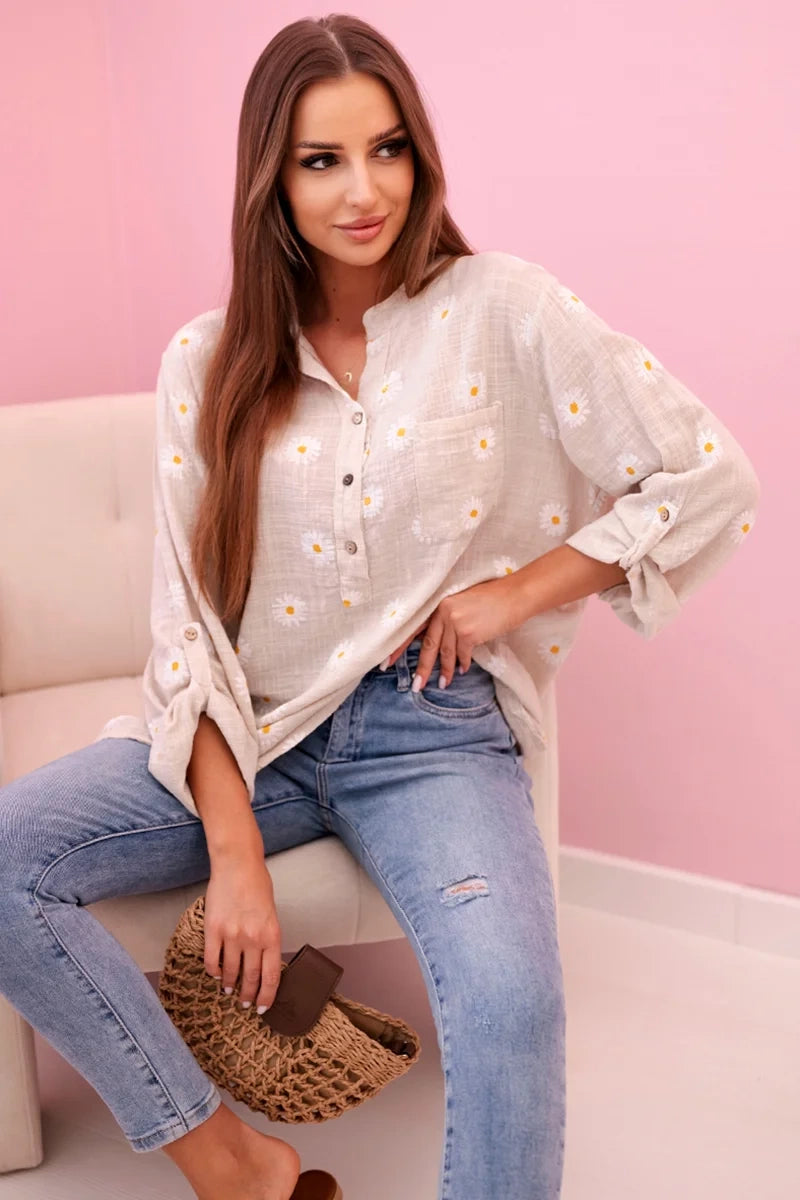 Ľanová dámska blúzka s kvetmi, dlhými rukávmi a gombíkmi béžová + biela univerzálne