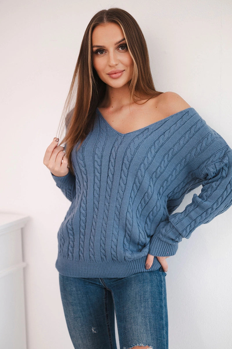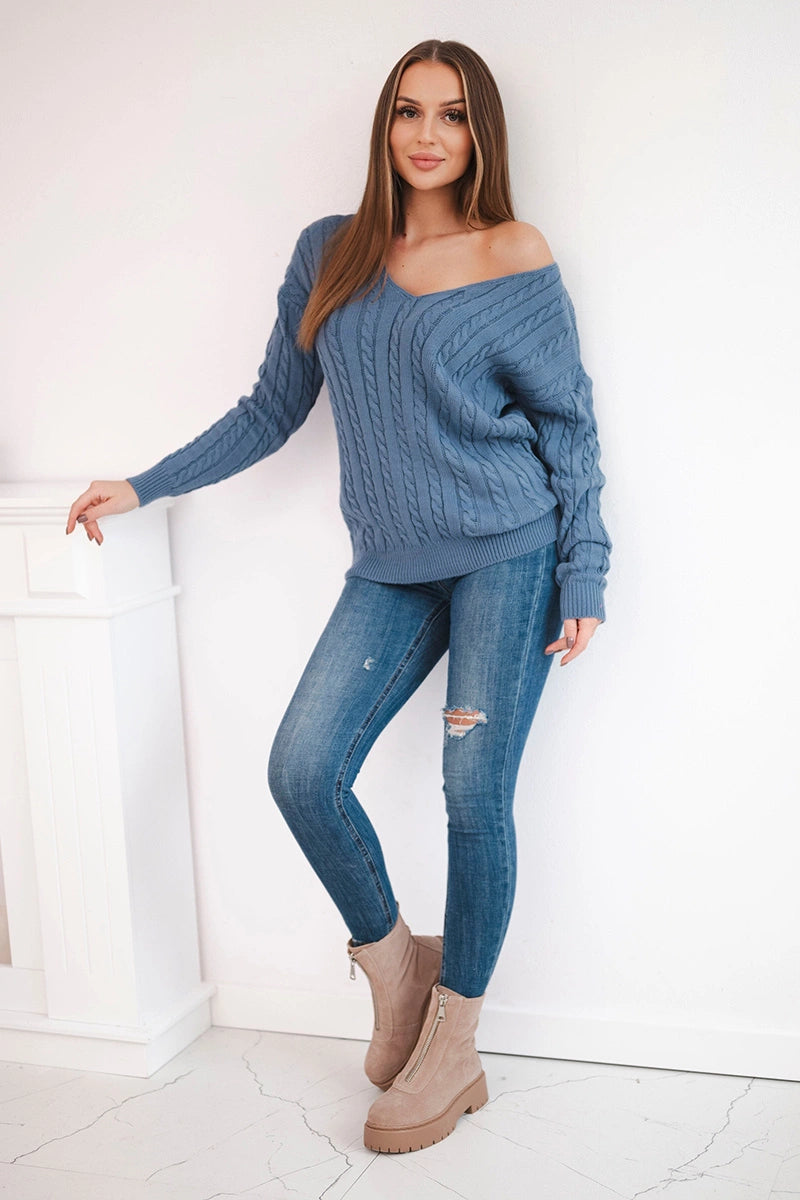 Pletený sveter s výstrihom do V denimovej farby univerzálne