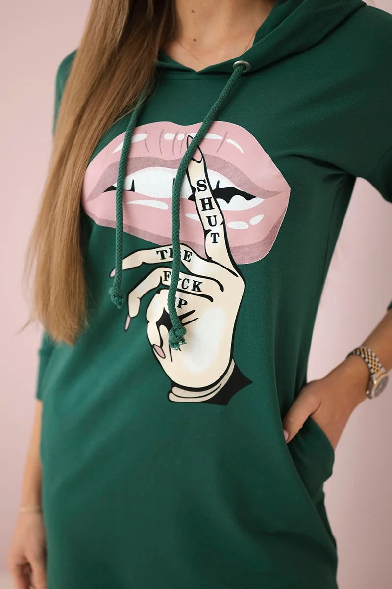Šaty s dlhším chrbtom a farebnou potlačou tmavo zelená univerzálne