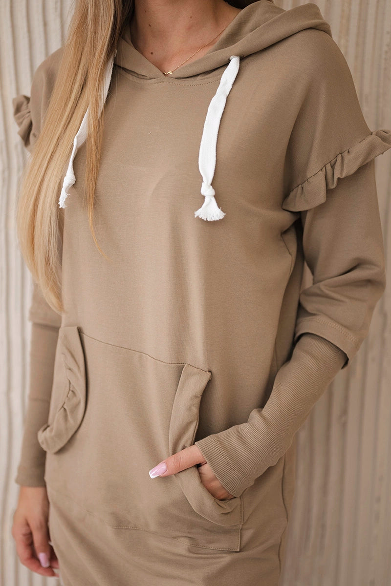 Šaty s ozdobnými volánmi a kapucňou ťavej farby univerzálne