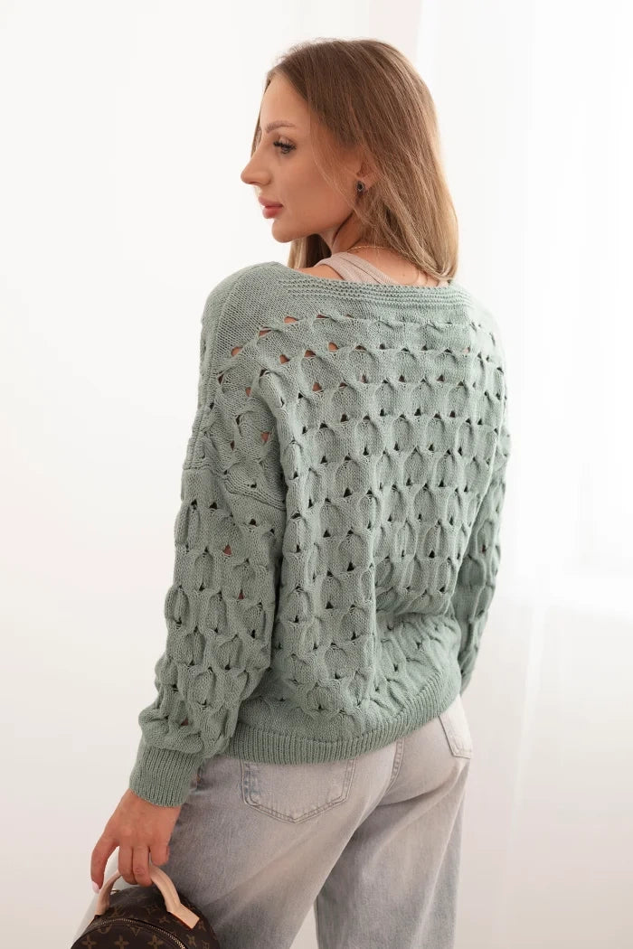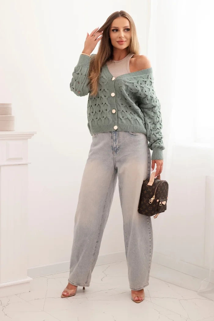 Sveter dámsky ażurowý s dekoltom V a zlatými gombíkmi tmavá mäta univerzálne