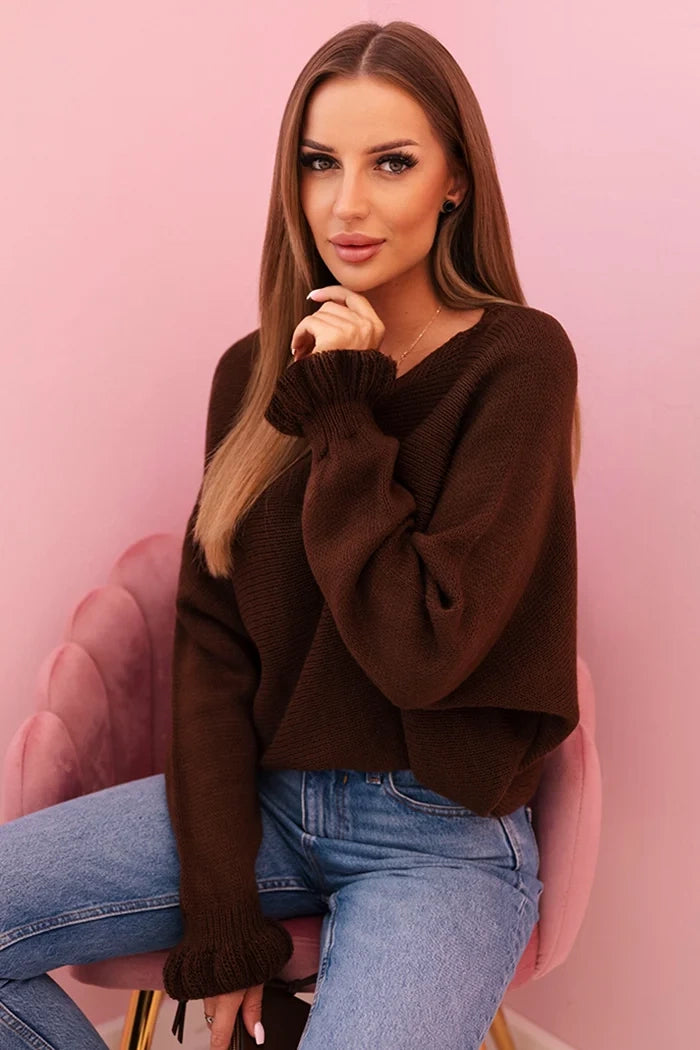 Sveter dámsky z mohairu s nariasenými rukávmi a výrezom na chrbte hnedý univerzálne