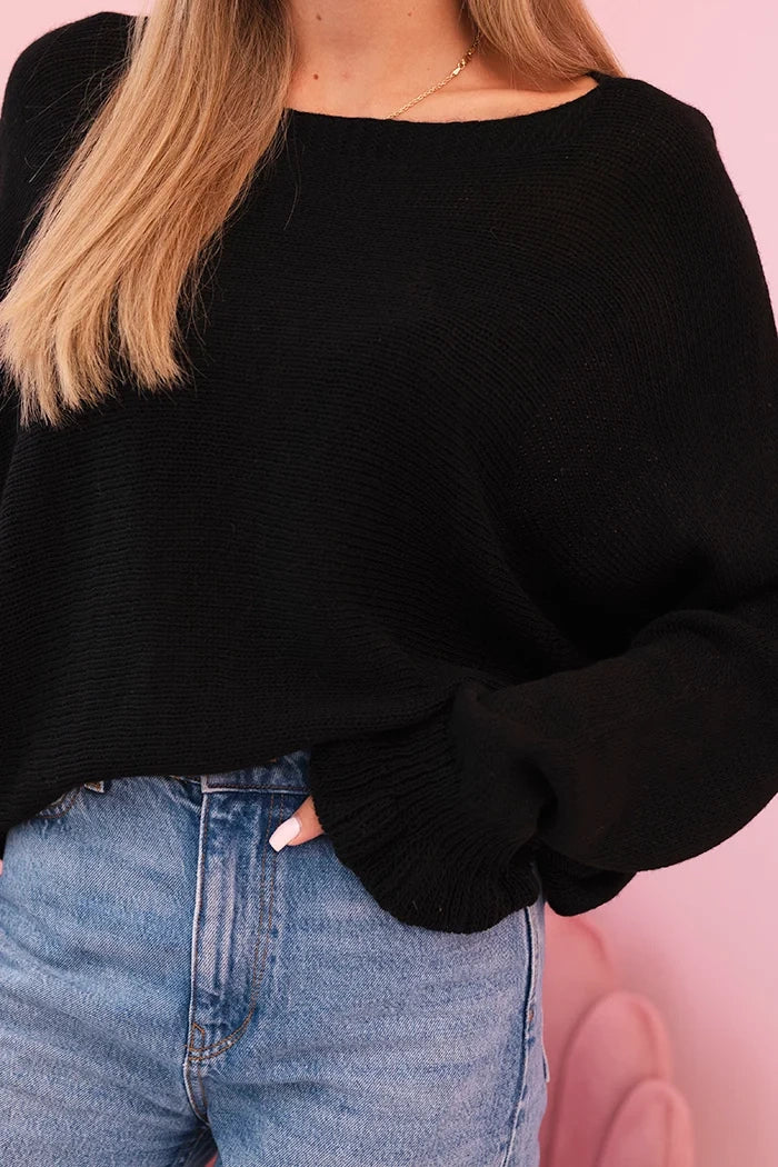 Sveter dámsky z mohéru s nariasenými rukávmi a výrezom na chrbte čierny univerzálne