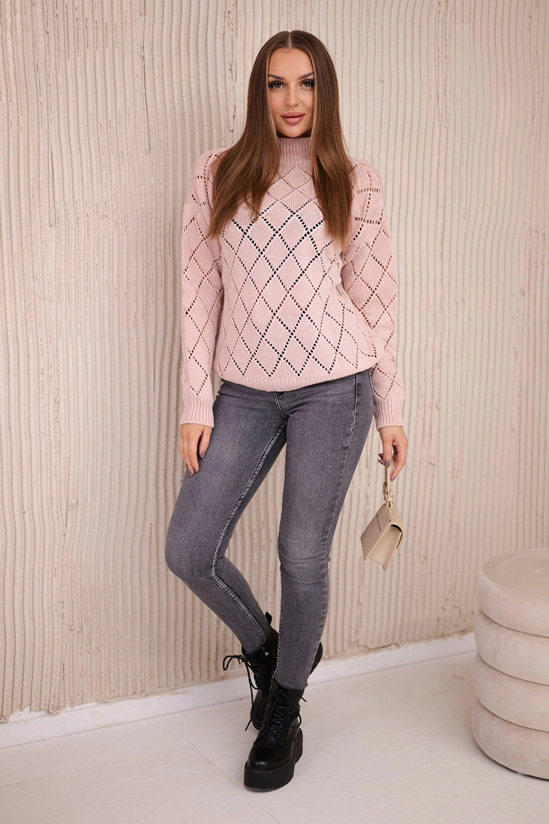 Sveter s vysokým krkom s diamantovým vzorom púdrovo ružová univerzálne