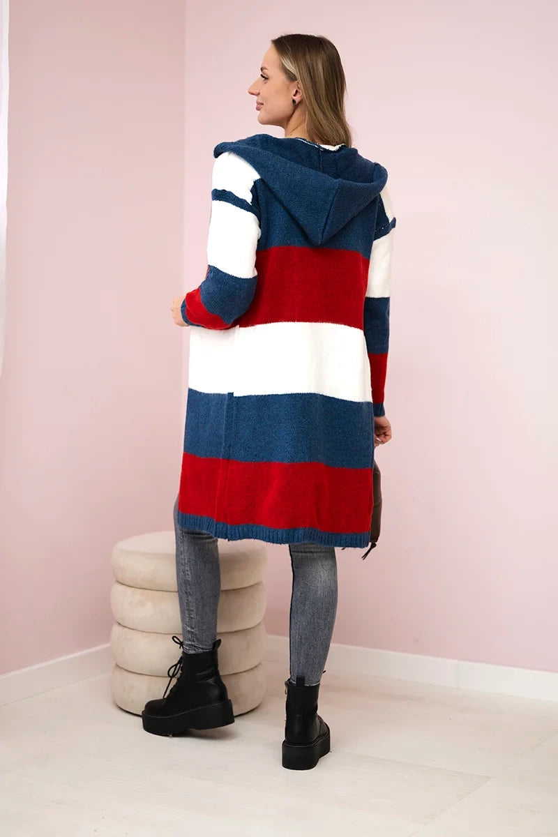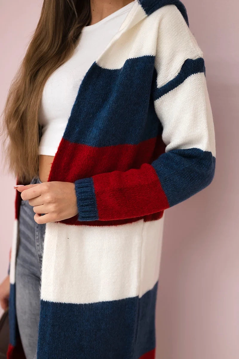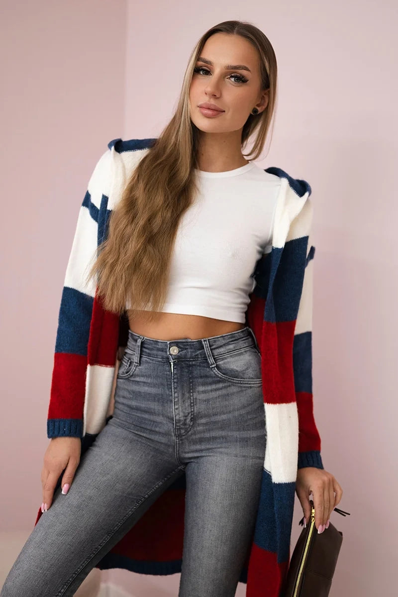 Trojfarebný pruhovaný sveter ecru+džínsy+červená univerzálne