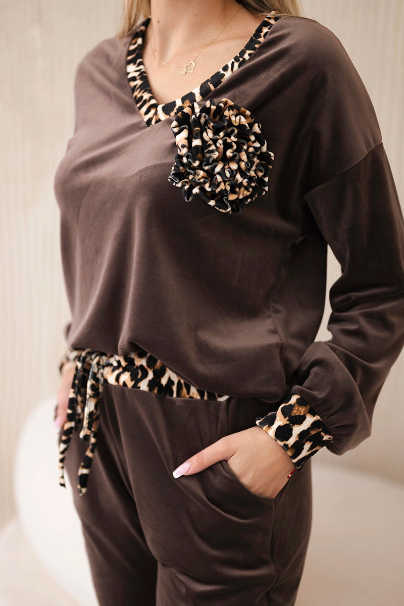 Velúrová komplet s ozdobnou brošňou hnedý univerzálne
